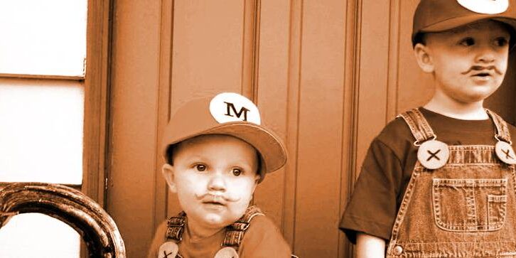 This duo costume really does put the “Super” in “super easy.” You can turn your tots into video game superheroes with supplies you probably already own. A red or green t-shirt, a matching cap, overalls, yellow felt buttons marked with a sharpie, and DONE.